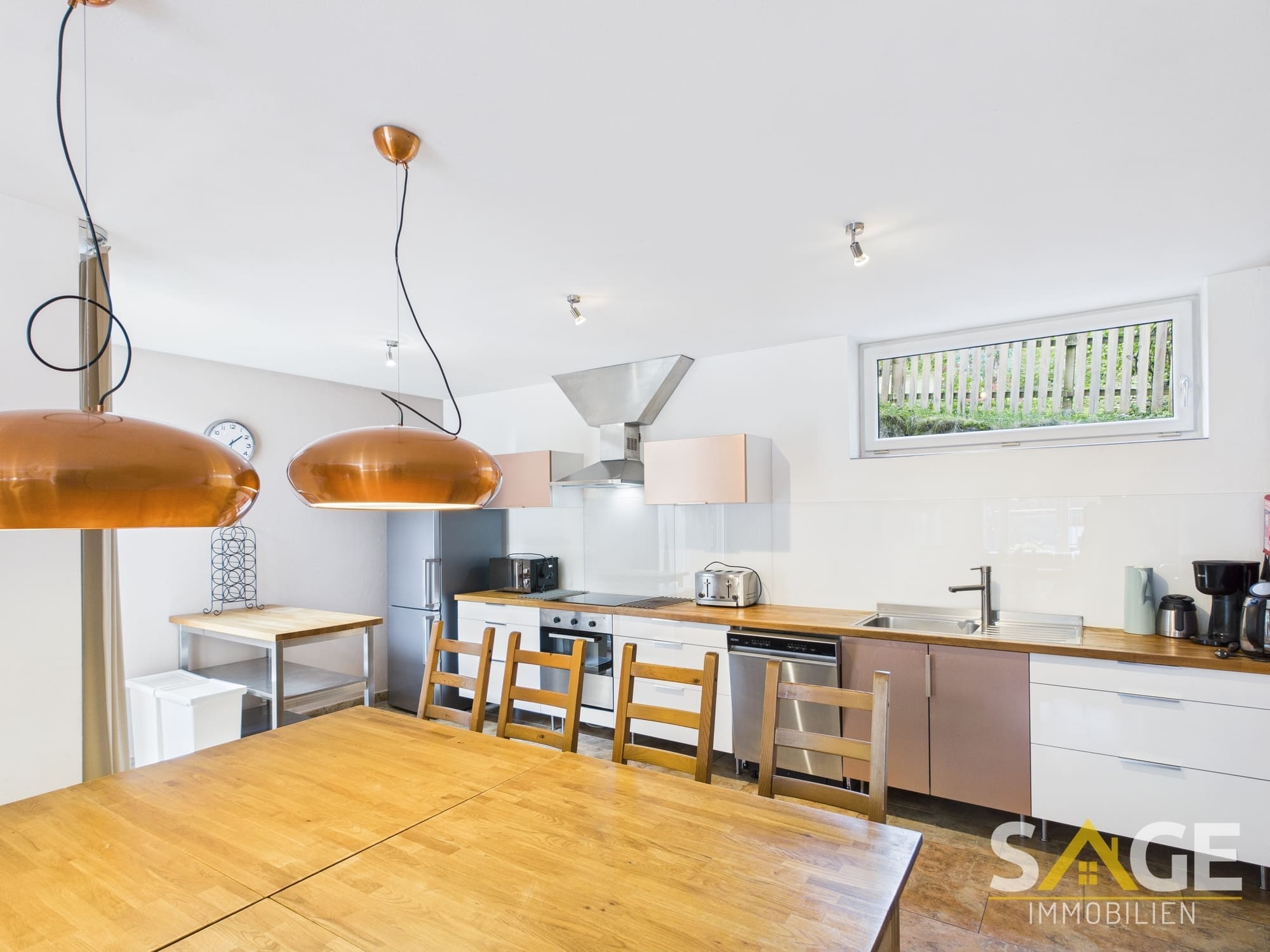 The entire ensemble is divided into 3 independent areas: a private part with around 120 m² of living space with a large, open living area with integrated kitchen and wood-burning stove, balcony and terrace access, two bedrooms, bathroom with bath and shower and a further bedroom with wardrobe area and bathroom en suite.