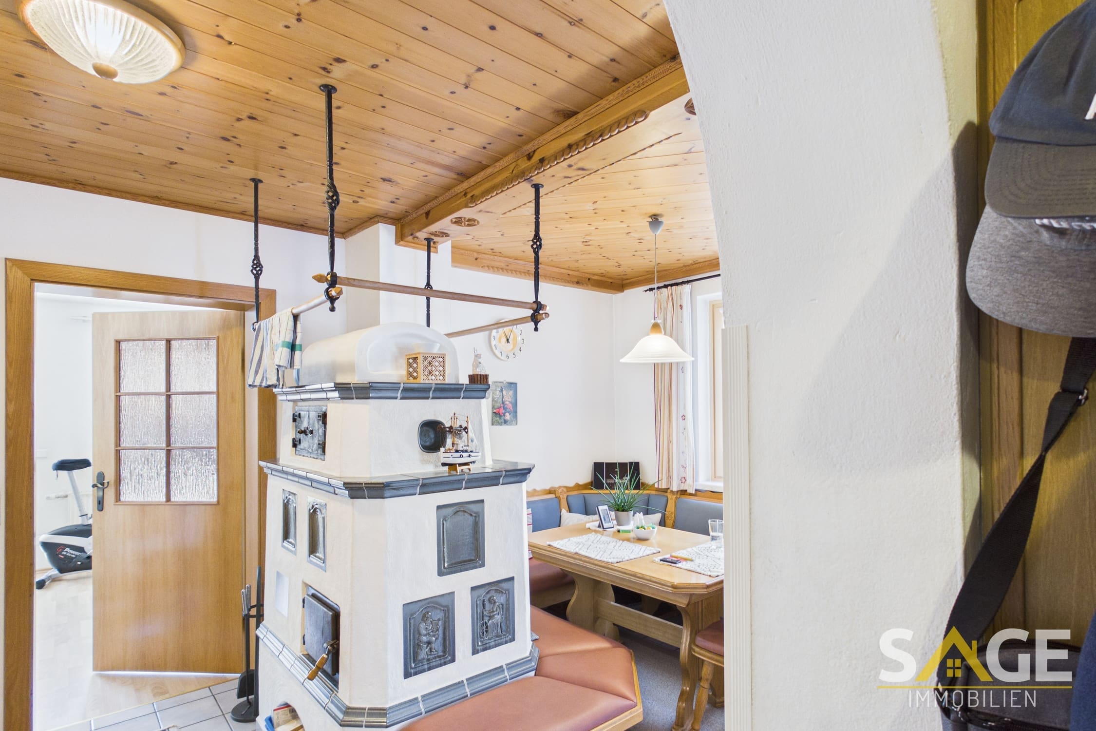 Küche mit Eßplatz und Kachelofen, Wohnraum mit Terrassenzugang, Gästetoilette, Garderobe